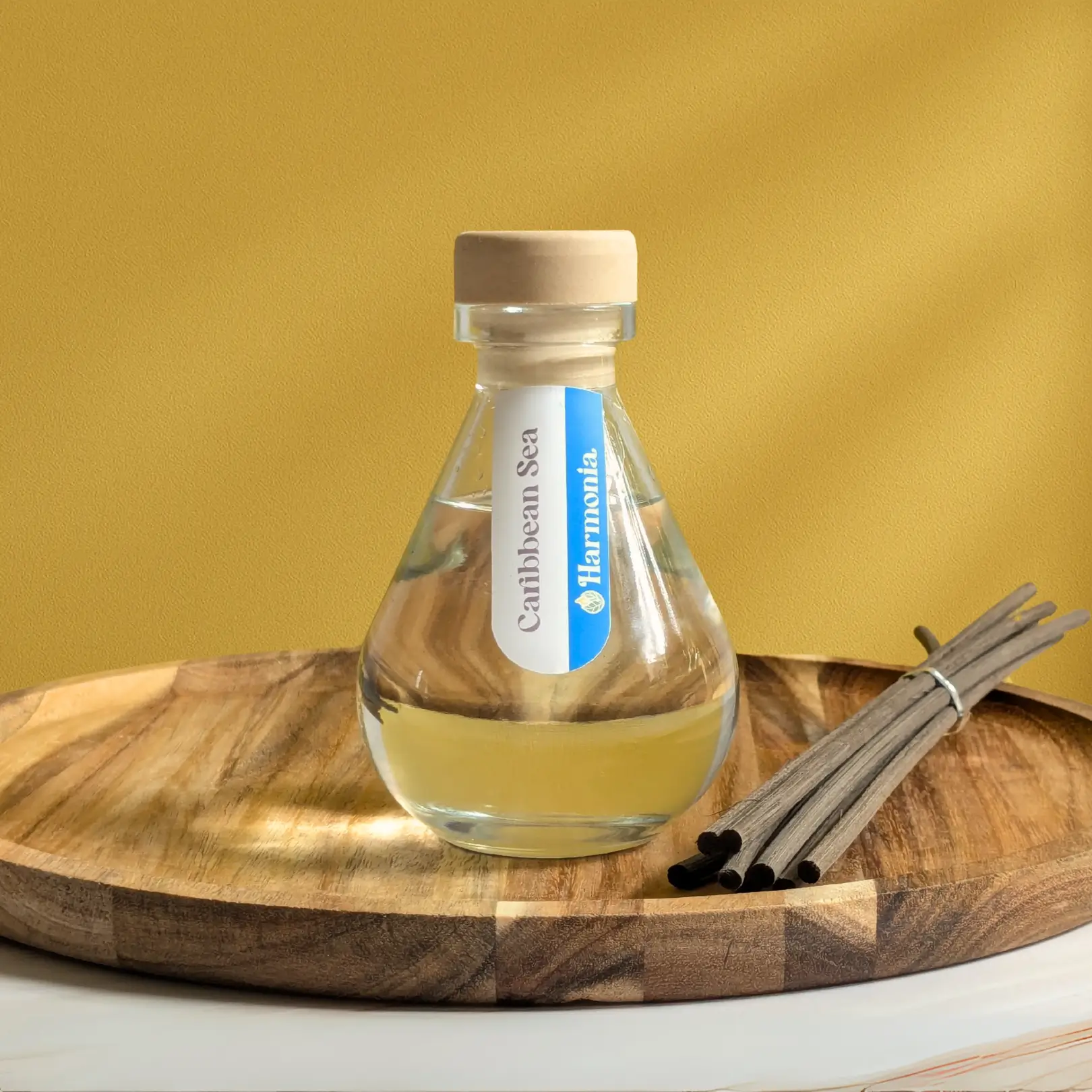 Each Caribbean Sea diffuser is beautifully presented in a clear glass vessel, complete with natural rattan reeds that gently release the fragrance into the air.