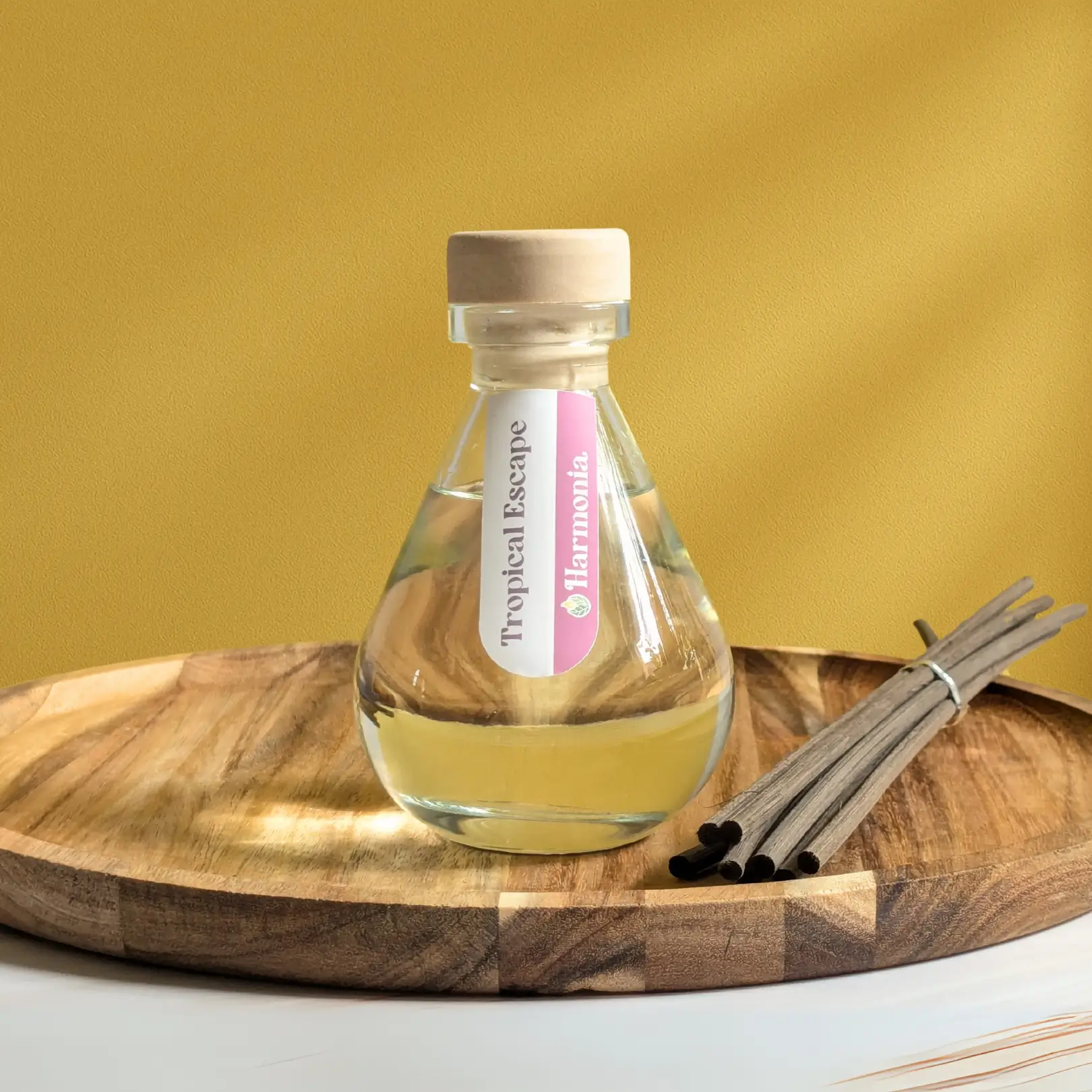 Each Tropical Escape diffuser is beautifully presented in a clear glass vessel, complete with natural rattan reeds that gently release the fragrance into the air.