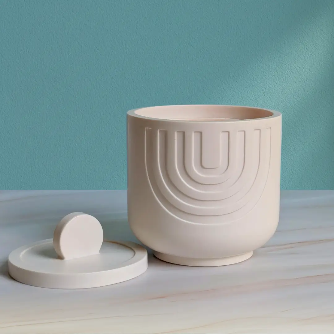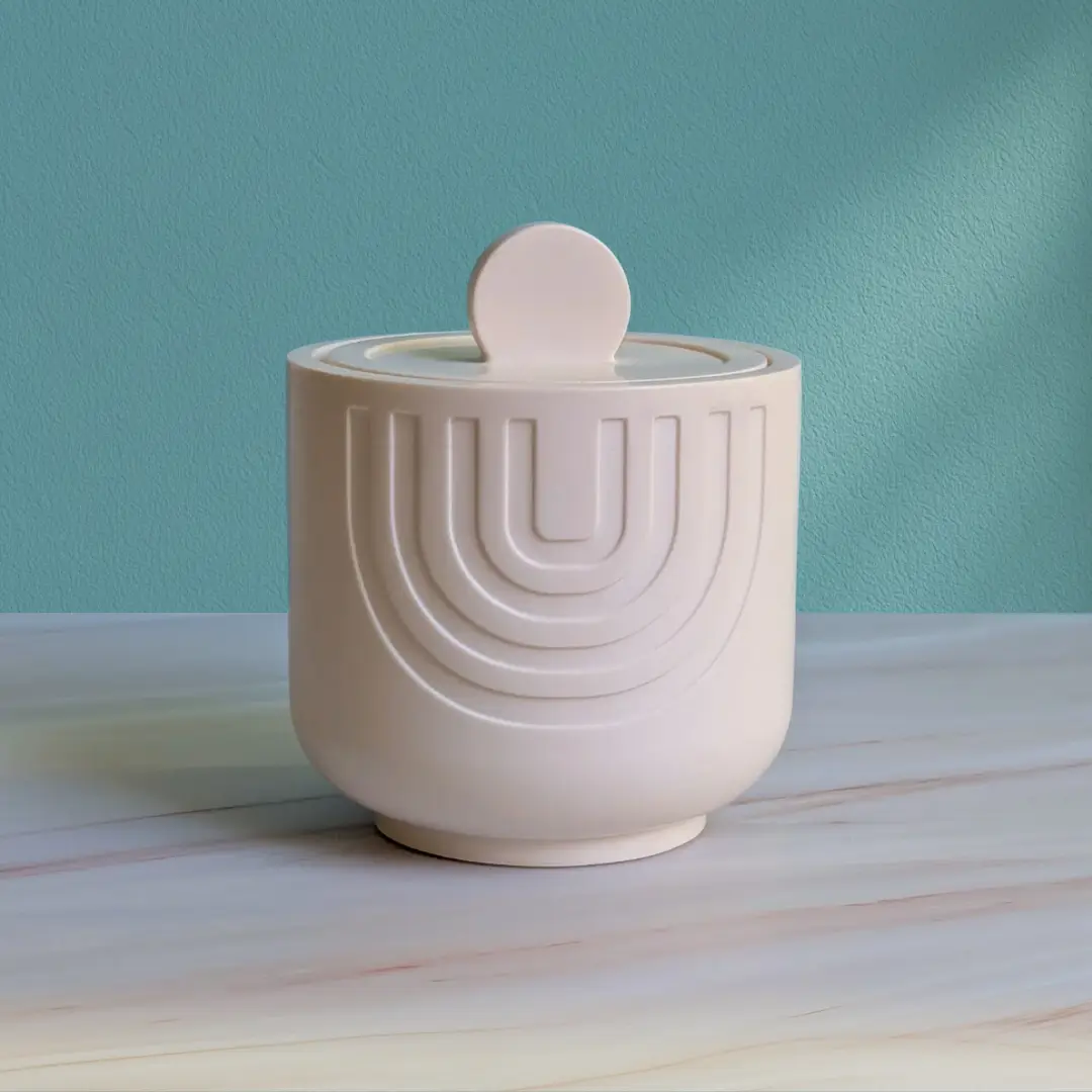 This pot is made from jesmonite, a modern composite material known for its smooth stone-like finish, durability and lightweight feel. Each piece is handmade by us, giving it a unique character and an artisanal touch. Its refined matte texture and clean geometric lines create a contemporary, sculptural look. With its generous shape and matching lid, it becomes an elegant decorative piece that blends beautifully into any interior.